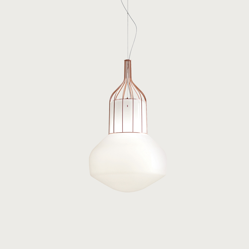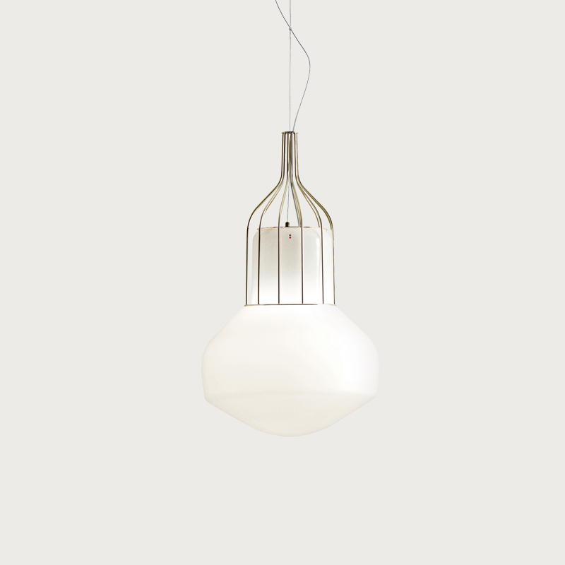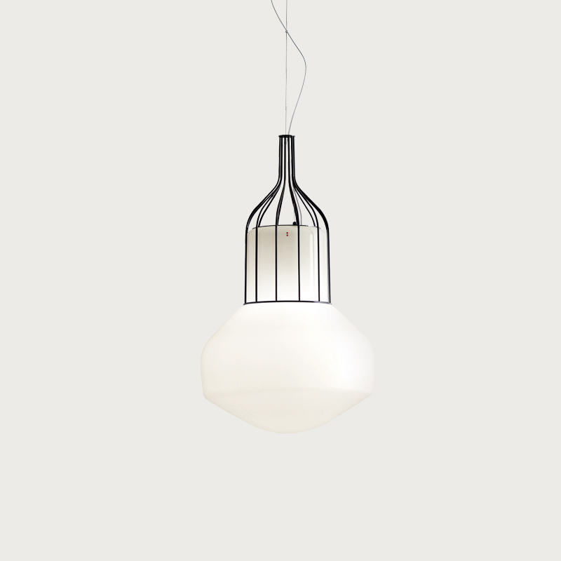 Designer Guillaume Delvigne drew inspiration from the "lighter than air" aircraft with which this collection shares its name. The concept of a floating glass luminaire was born, whereby the cage appears to magically suspend the glass with no support, resulting in an elegant and interesting statement piece that enhances spaces it is used in.