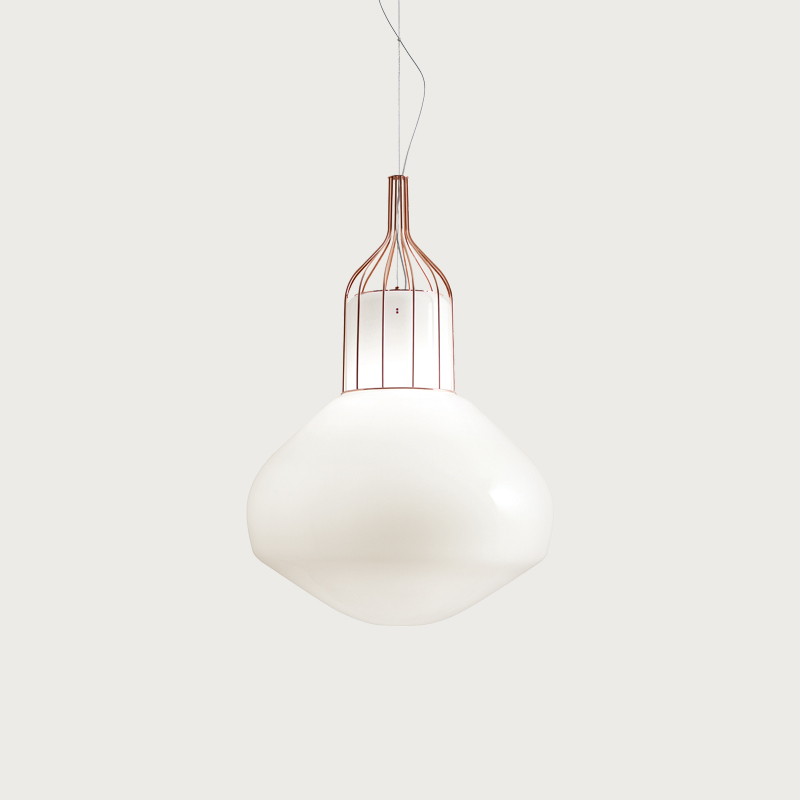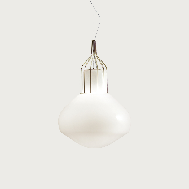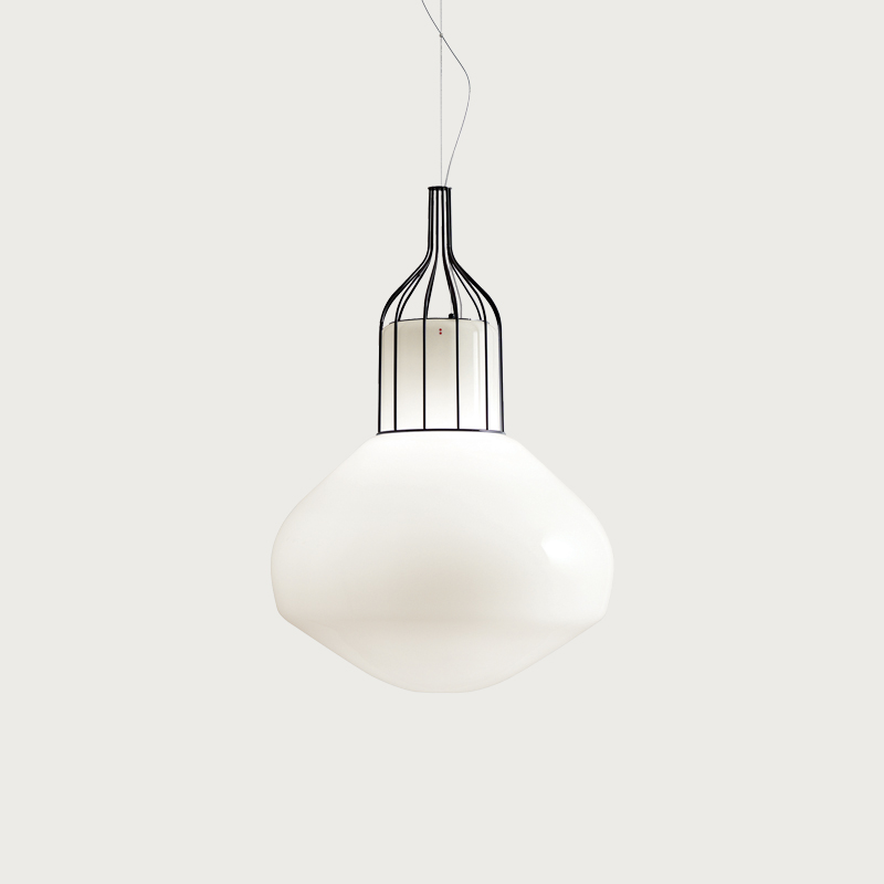 Designer Guillaume Delvigne drew inspiration from the "lighter than air" aircraft with which this collection shares its name. The concept of a floating glass luminaire was born, whereby the cage appears to magically suspend the glass with no support, resulting in an elegant and interesting statement piece that enhances spaces it is used in.