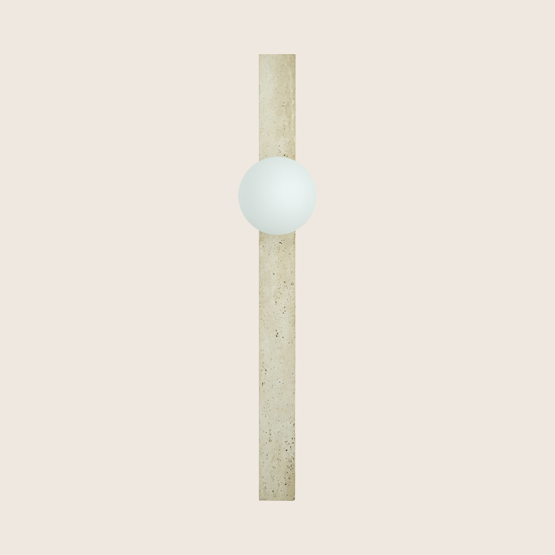 A sleek travertine wall light with a vertical, column-like form and a softly glowing opal sphere. The Petra Stilos brings sculptural warmth and natural stone texture to hallways, living spaces and refined architectural interiors.