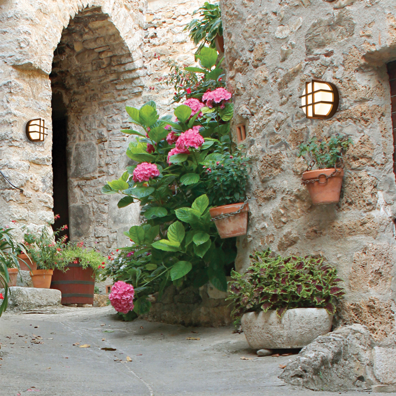 The Porta Wall Light brings a warm, old-world charm to outdoor spaces, pairing a soft opal diffuser with a protective, architectural frame inspired by traditional Mediterranean gateways.